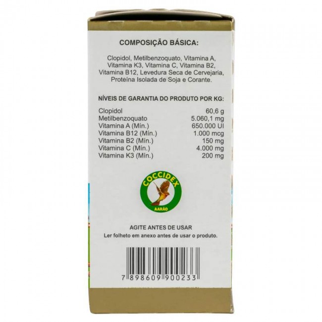 E um premix vitamínico complementar com aditivo anticoccidiano, indicado para Aves na prevenção da coccidiose causada por Eimeria acervulina, E. brunetti, E. necatrix, E. maxima, E. tenella, E. mivati., E. mitis, E. praecox; podendo ser usada em aves de todas as idades.