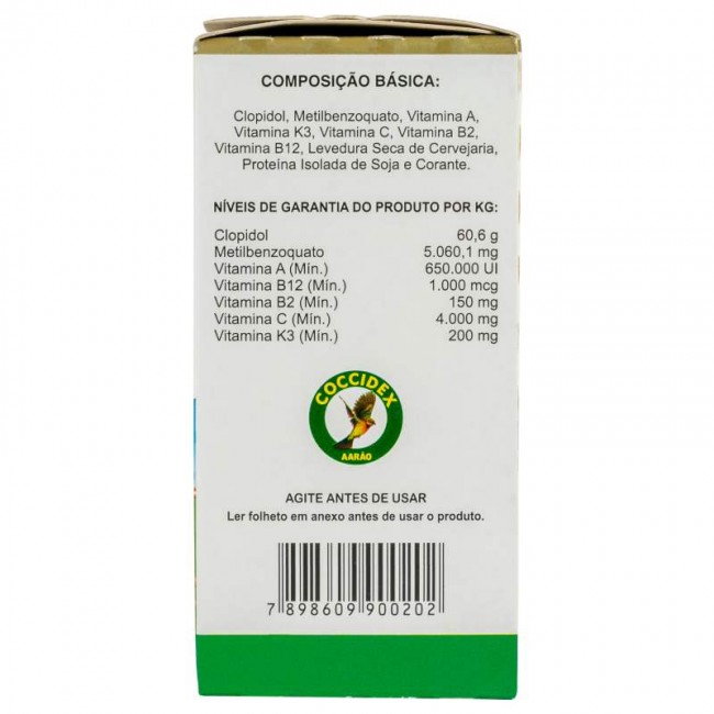 E um premix vitamínico complementar com aditivo anticoccidiano, indicado para Aves na prevenção da coccidiose causada por Eimeria acervulina, E. brunetti, E. necatrix, E. maxima, E. tenella, E. mivati., E. mitis, E. praecox; podendo ser usada em aves de todas as idades.