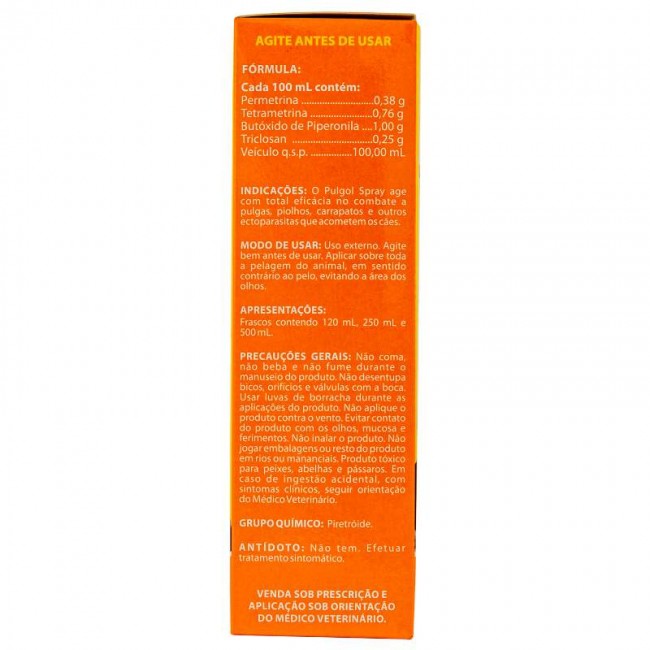 O PULGOL SPRAY age com total eficácia no combate a pulgas, piolhos, carrapatos e outros ectoparasitas que acometem cães.