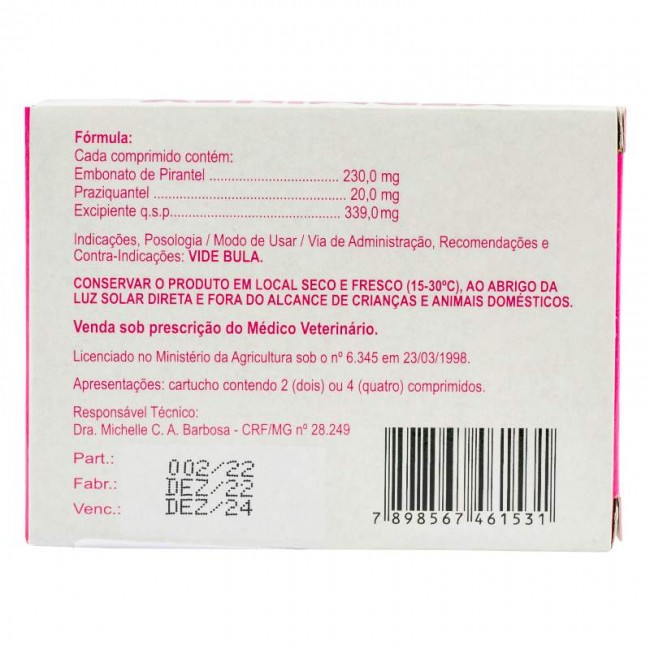deve ser administrado na dose de 1 comprimido para cada 4K g de peso. O