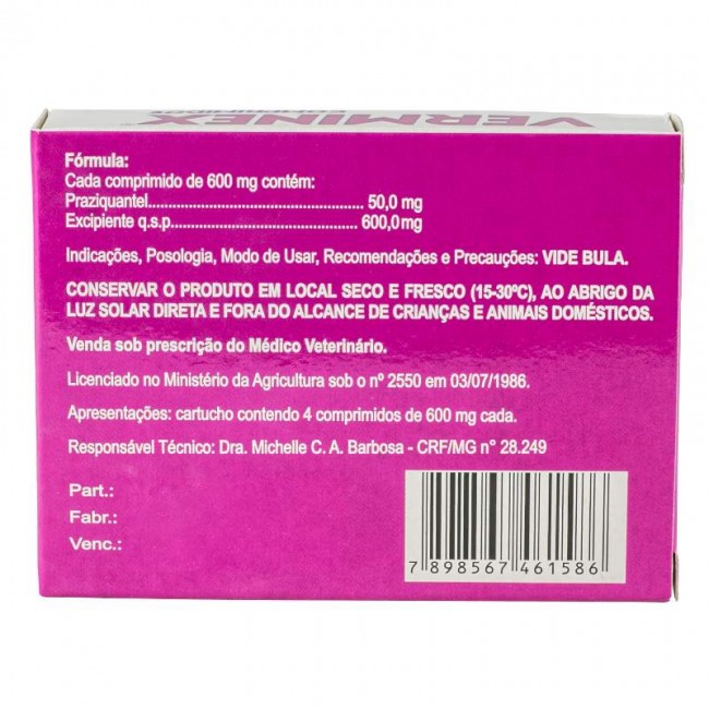 O Vermífugo Verminex Vetbras é a solução confiável para manter a saúde do seu cão ou gato em dia, proporcionando proteção eficaz contra vermes e parasitas. Sua fórmula de amplo espectro de ação abrange diversos tipos de vermes, garantindo o bem-estar do seu animal de estimação.