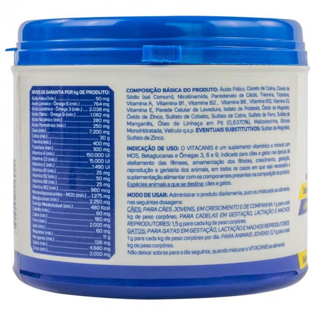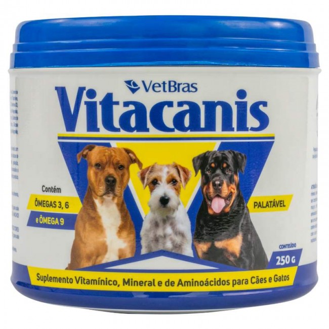 O VITACANIS é um suplemento vitamínico, mineral e de aminoácidos indicado para cães e gatos nas épocas de aleitamento das fêmeas, amamentação dos filhotes, crescimento, gestação, reprodução e geriatria dos animais, em todos os casos em que seja necessária a suplementação de vitaminas, minerais e aminoácidos presentes na composição do produto.