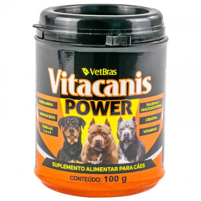 Suplemento Vitacanis Power 100gr é um suplemento vitamínico, mineral e de aminoácidos indicado para cães e gatos nas épocas de aleitamento das fêmeas, amamentação dos filhotes, crescimento, gestação, reprodução e geriatria dos animais, em todos os casos em que seja necessária a suplementação de vitaminas, minerais e aminoácidos presentes na composição do produto.