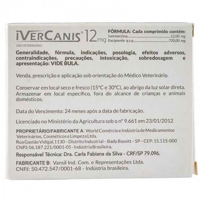 Ivercanis 12mg Ivermectina da fabricante World Veterinária tem como componente ativo a Ivermectina, um agente ectoparasiticida. A ação da Ivermectina contra os parasitas se relaciona à inibição da motilidade do parasito. Sabe-se hoje que essa molécula se liga seletivamente com alta afinidade aos canais de íon cloreto ligados ao glutamato nos nervos e nas células musculares dos invertebrados. Esses canais podem ocorrer bem próximo aos locais ligados ao GABA (ácido yaminobutírico).